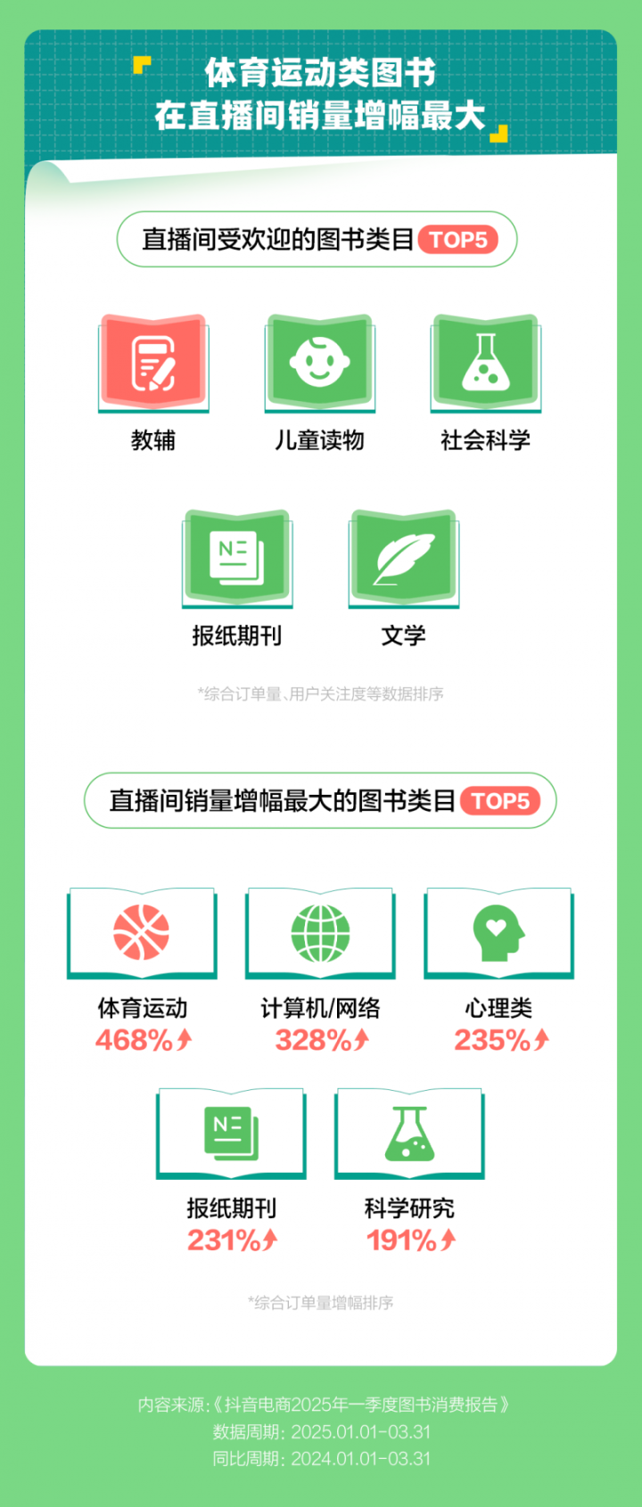 随着短视频和直播的普及,直播买书已经成为新常态。去年,《人民文学》杂志、《收获》杂志等相继在直播间走红,单场直播均售出超8万套杂志。《收获》杂志主编程永新还坦言:“‘与辉同行’直播了以后,又重上了十多万册。”今年一季度延续去年消费趋势,报纸期刊仍位列直播间最受欢迎类目的前五位,此外,榜单还包括教辅、儿童读物、社会科学和文学。今年是“健康体重管理年”活动实施的第二年,体育运动类图书在直播间热销。一季度,抖音电商体育运动类图书销量同比增长468%,成为直播间销量增幅最大的图书类目。